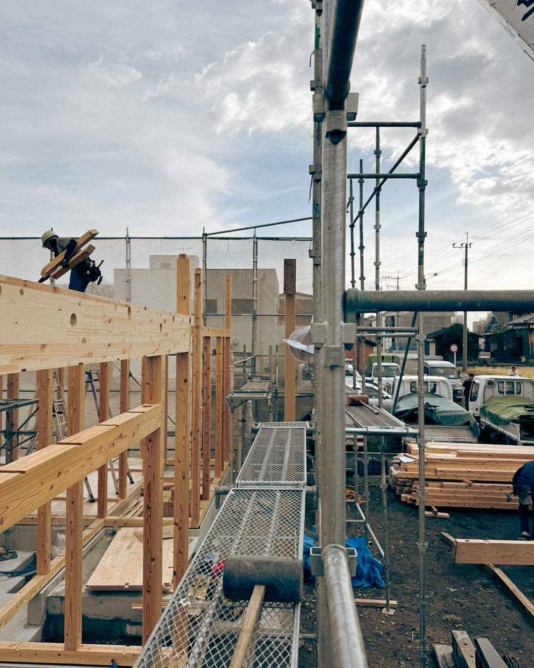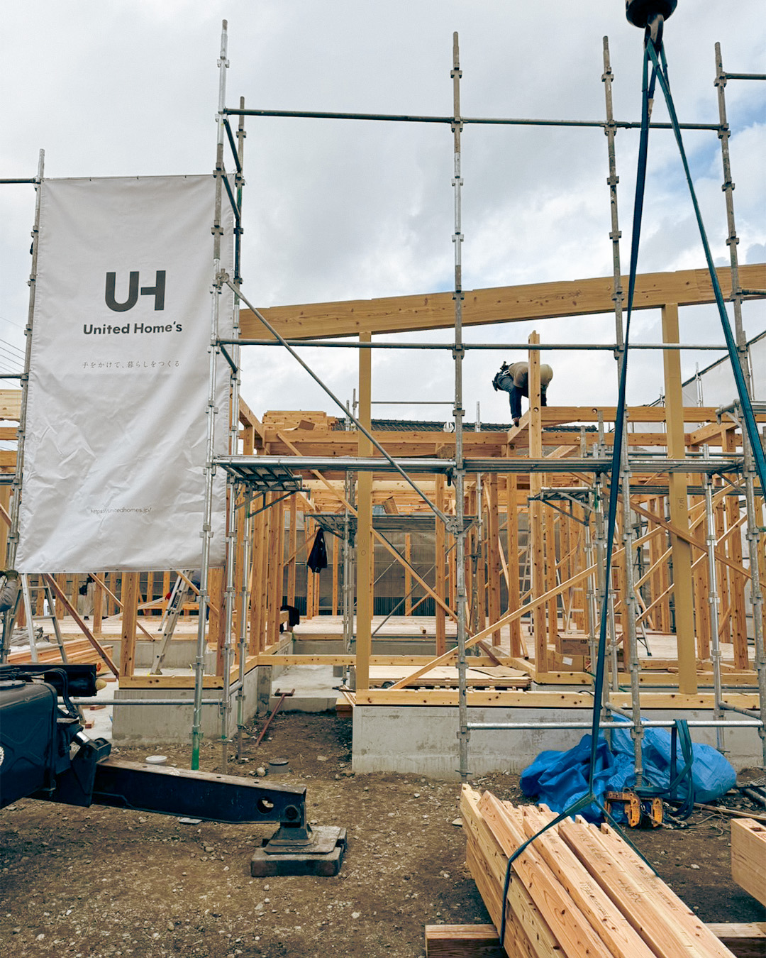 現場では大工職人たちがチームで作業を進め、柱や梁を一本ずつ組み上げていきます。