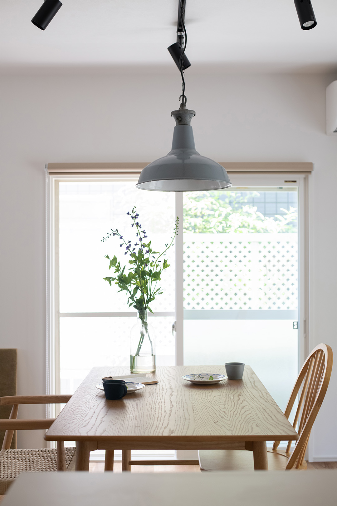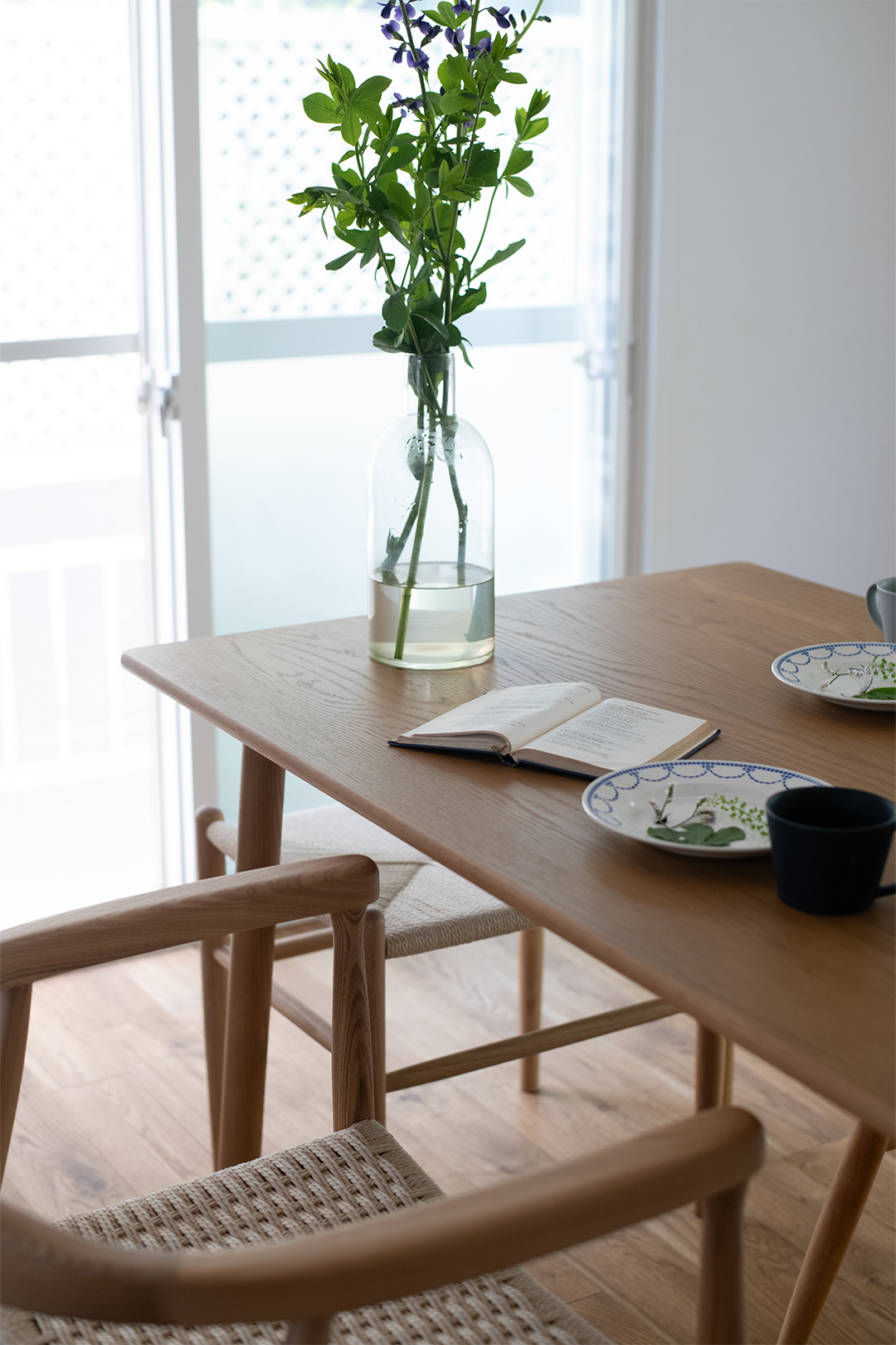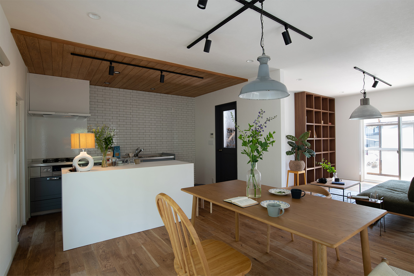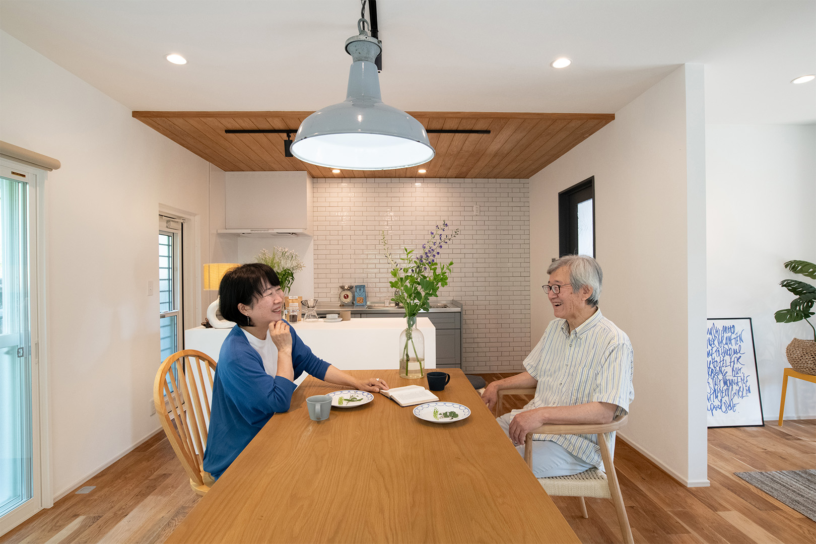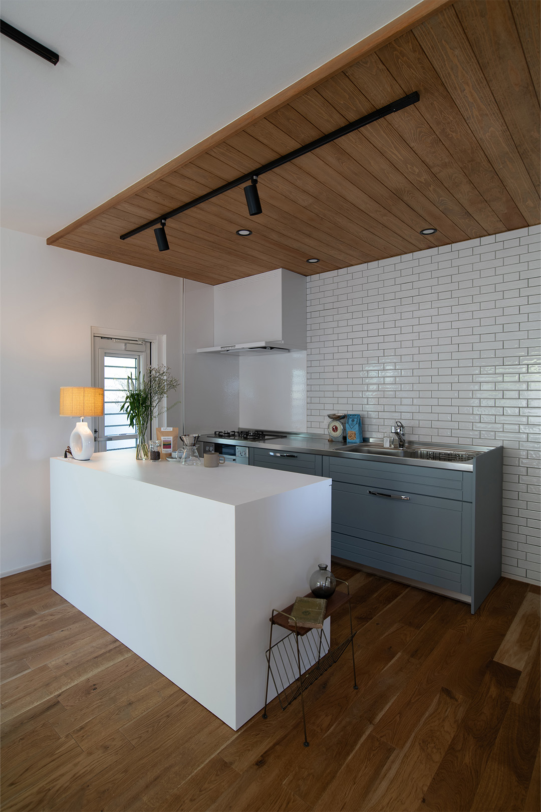 内装デザインのベースに選んだのは無垢のオーク材の床。ご夫婦がお持ちだった家具や絵画と響き合うよう、木天井や白タイルをあしらったキッチン、オーダーメイドの白い対面収納カウンターを配置。空間のアクセントにはチャコールグレーのドアを取り入れ、淡い色調のインテリアに洗練されたコントラストを与えています。